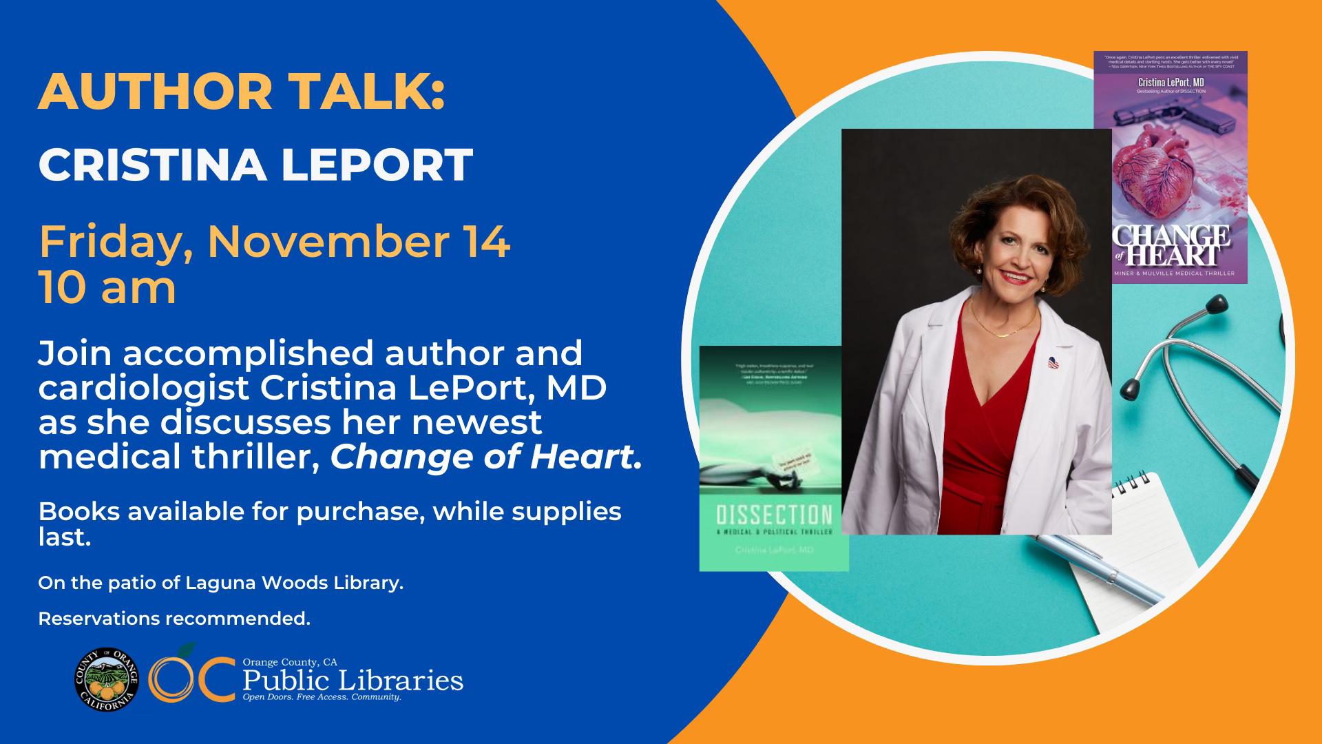 CORRECTION: Join me on 11/14/2025 Laguna woods Library Leport CristinaNov 04, 20251ShareHello again, everyone,As you can see from the announcement, the previous email had the wrong date.The book talk at the Laguna Woods library is on Friday, 11/14/2025, at 10 amLaguna Woods Library24266 El Toro RoadLaguna Woods, CA 92637I hope to see you there!Thank you,Cristina LePortPreviousNext